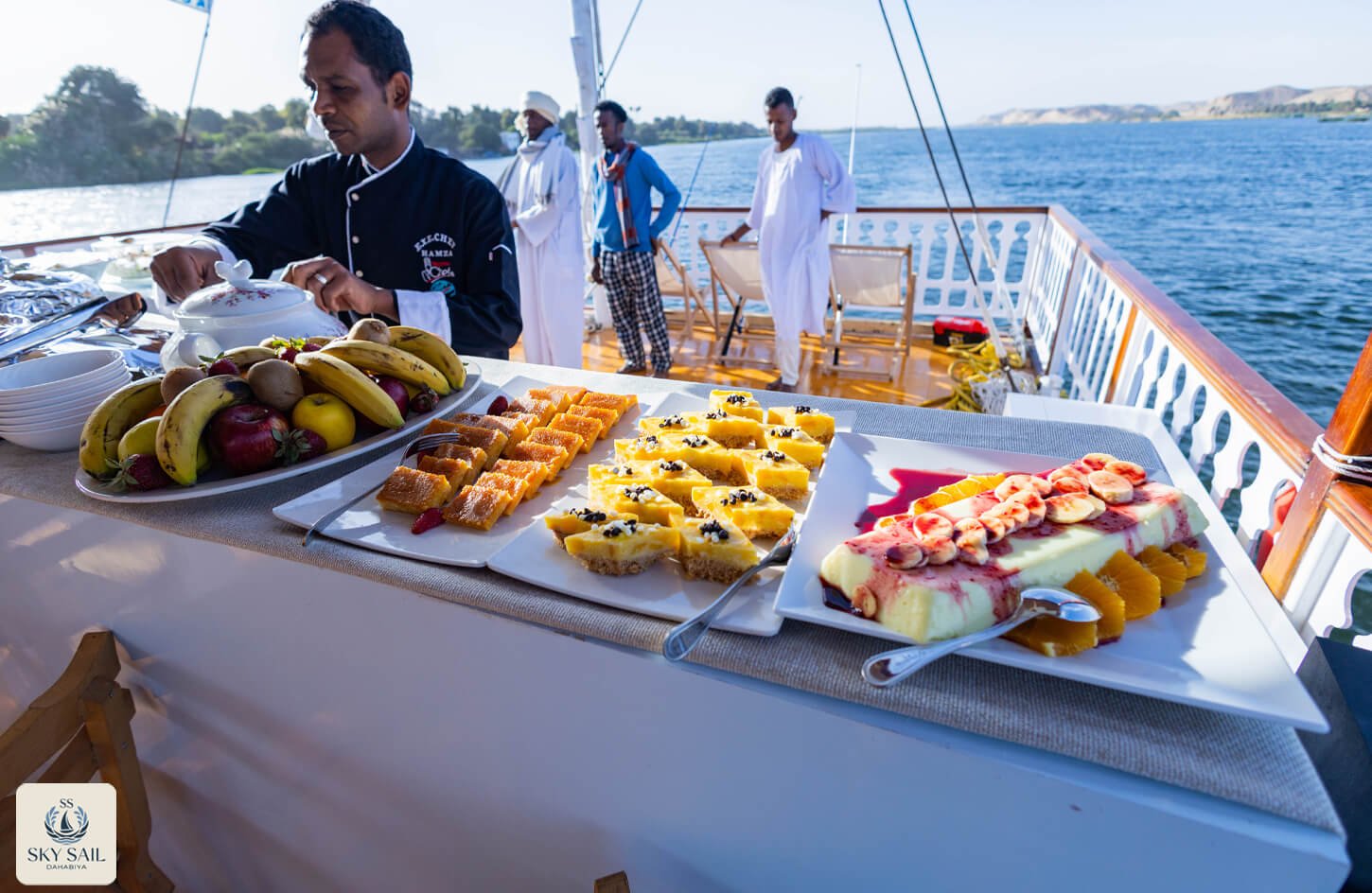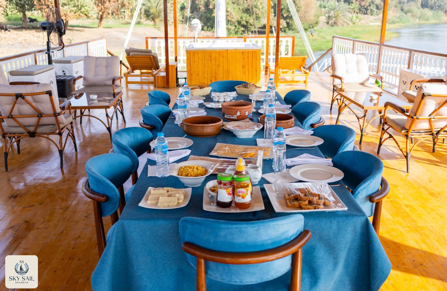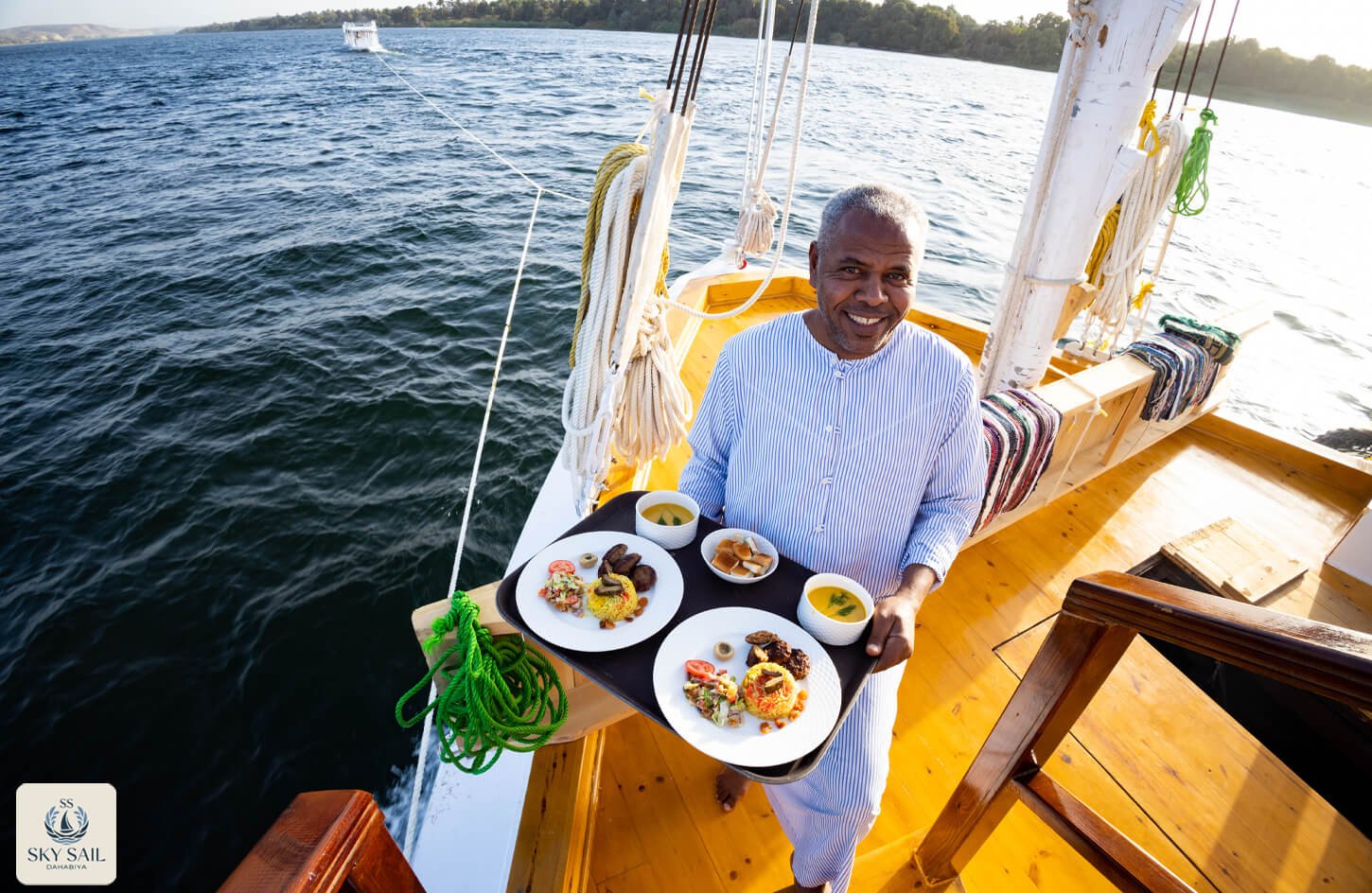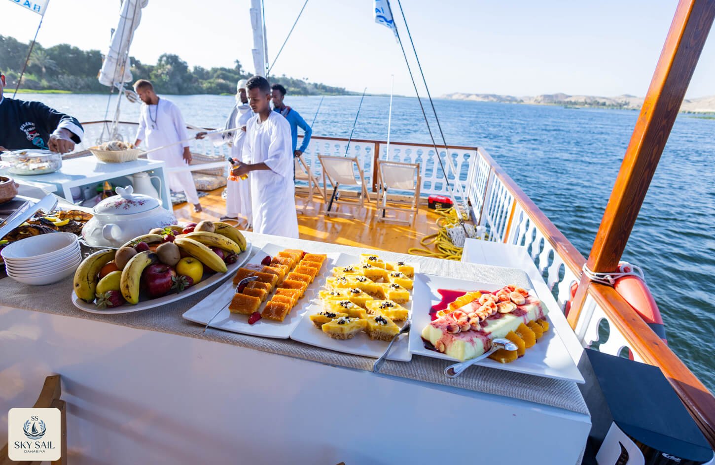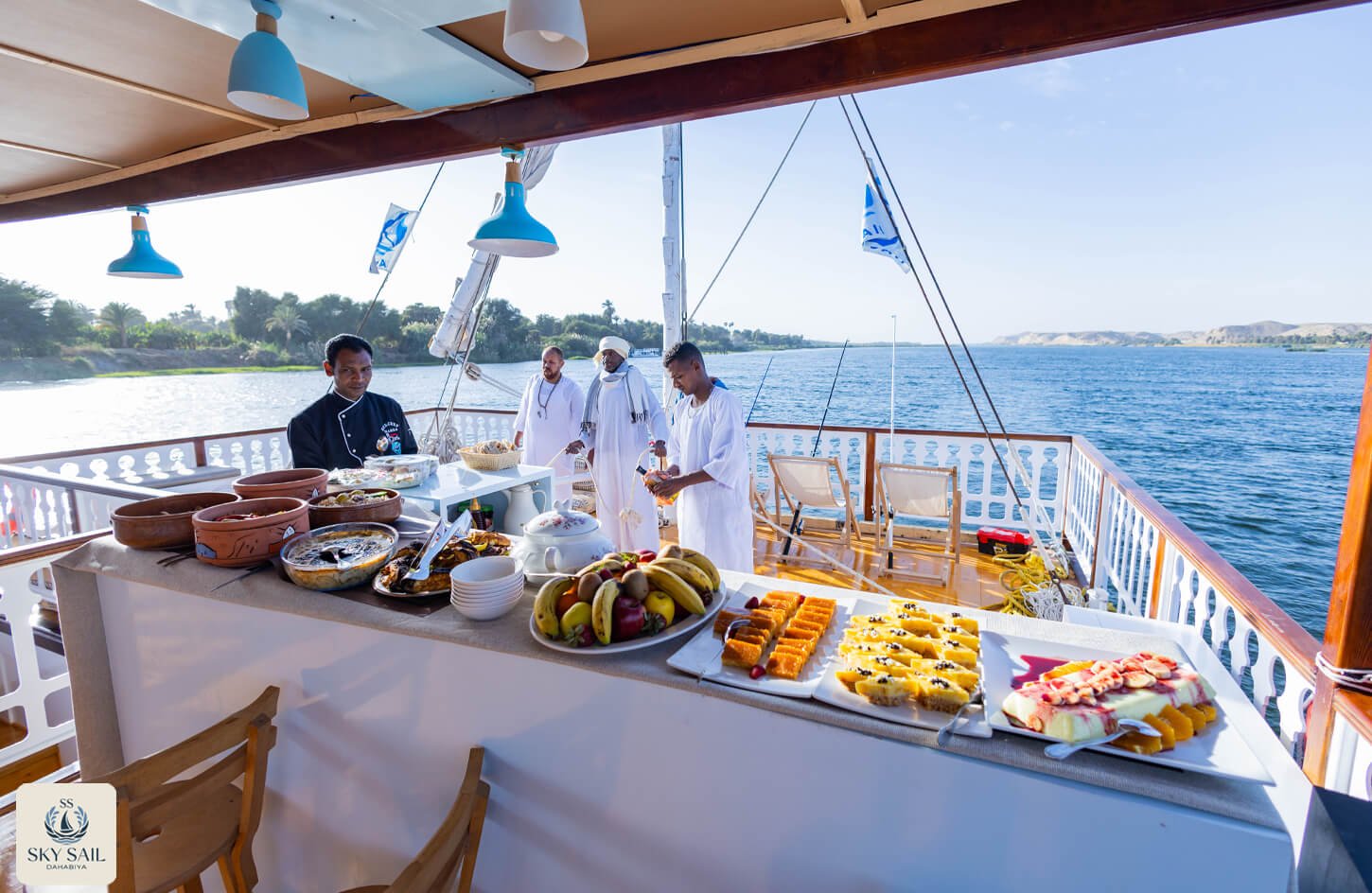 Savor the essence of Egyptian hospitality in our Dining Gallery. From sunlit breakfasts on deck to candlelit dinners under the stars, our gallery showcases the flavors, atmosphere, and shared moments that make dining aboard Sky Sail Dahabiya unforgettable. Each photo highlights the elegance of our culinary spaces and the rich variety of dishes served with care and authenticity. A visual feast awaits.